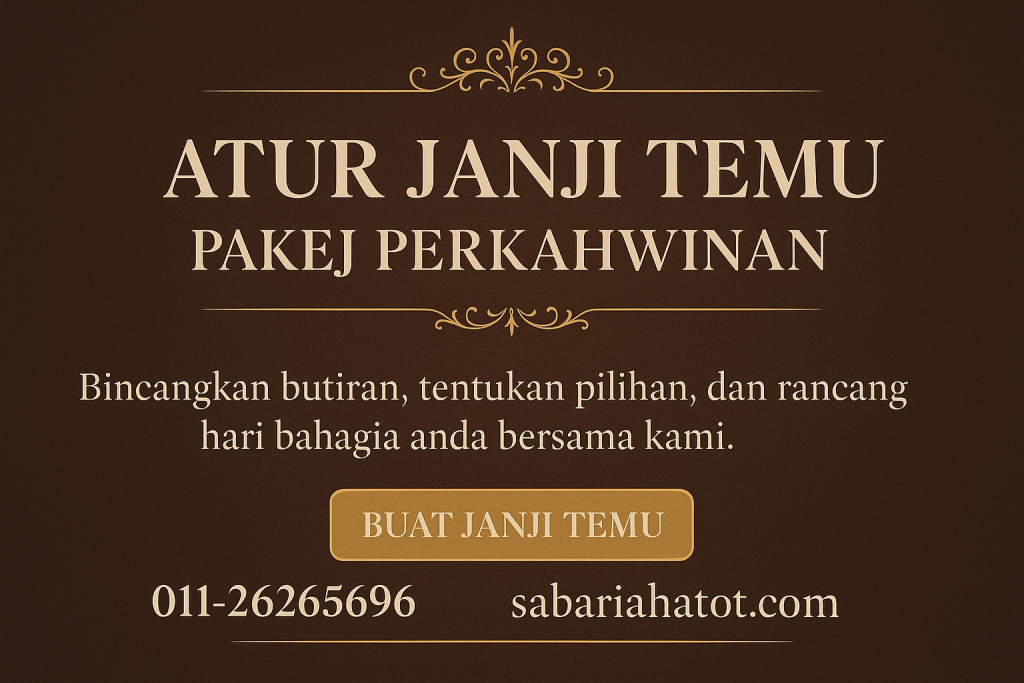 Tinjau Pakej Kahwin Bajet Mengapa Penting Atur Janji Temu Pakej Perkahwinan? Hari perkahwinan adalah detik paling berharga dalam hidup setiap pasangan. Ia bukan sekadar majlis penyatuan dua hati, tetapi juga momen penuh kenangan untuk keluarga dan tetamu. Untuk memastikan segala persiapan berjalan lancar, langkah paling bijak adalah dengan atur janji temu pakej perkahwinan lebih awal.
